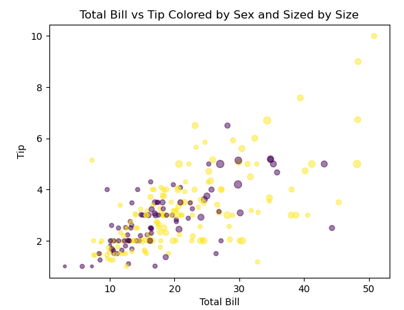 만약 지불 금액과 팁만을 사용하여 그린 산점도 그래프에 성별을 추가하면 점의 색상을 다르게 표현하여 그릴 수 있다.
