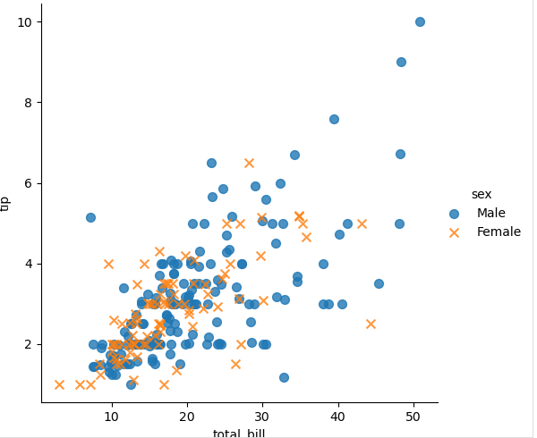scatter = sns.lmplot(x='total_bill', y='tip', data=tips, fit_reg=False, hue='sex', markers=['o', 'x'],scatter_kws={'s': 50})