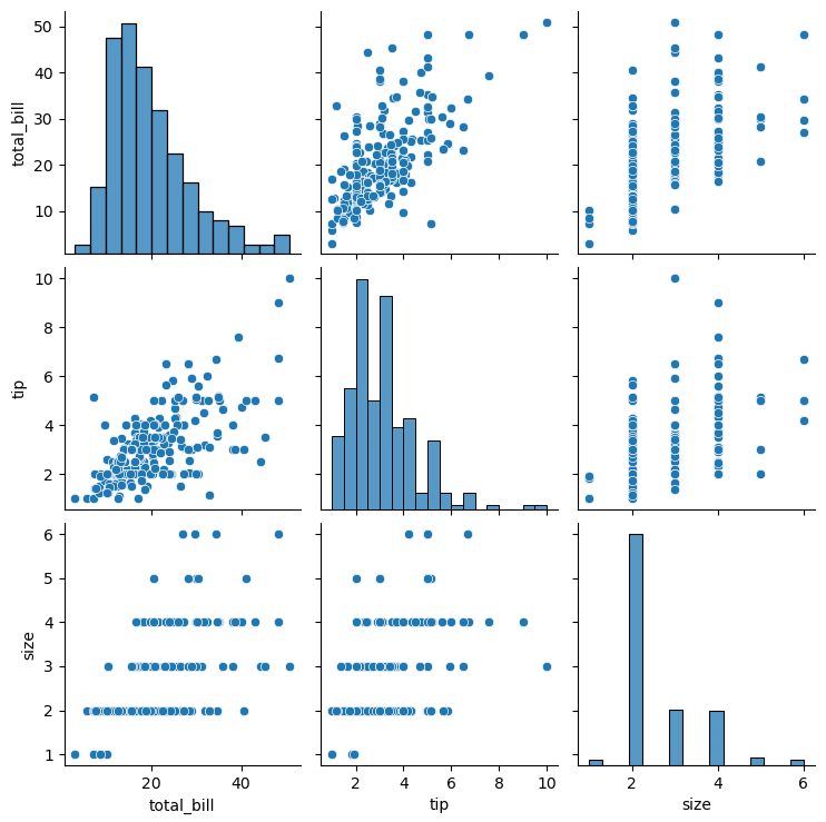 지금까지 드린 그래프들을 종합한 그래프라고 생각하면 된다. pairplot 메서드에 데이터프레임을 넣으면 된다.