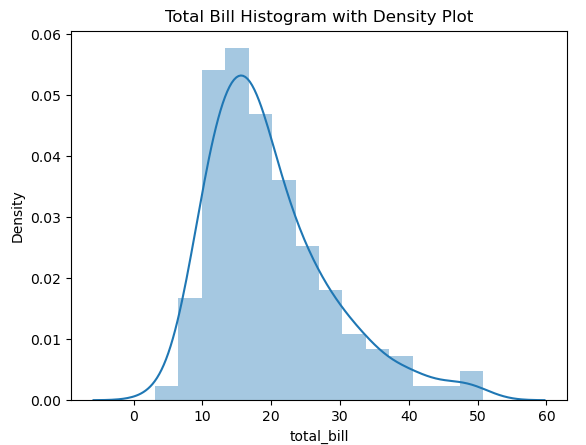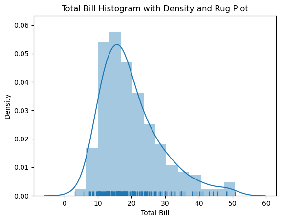 ax.set_title('Total Bill Histogram with Density and Rug Plot')