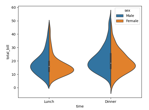 색상을 추가하여 바이올린 그래프를 그려보자. vilolinplor 메서드 hue 인잣값에 색상을 적용할 열 이름을 추가하면 된다.