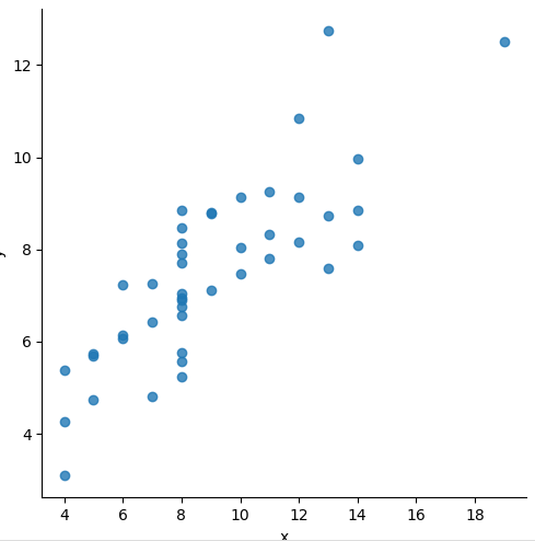 anscombe_plot = sns.lmplot(x='x', y='y', data=anscombe, fit_reg=False)