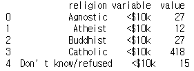 pew_long = pd.melt(pew, id_vars='religion')