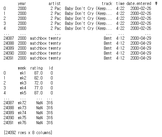 빌보드 차트 데이터는 artist, track, time, date.entered 열의 데이터가 반복된다. 이런 반복되는 데이터는 따로 관리하는 것이 좋다.