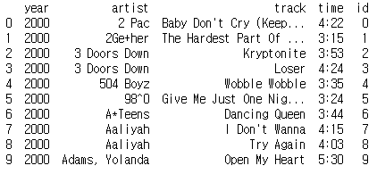 billboard_songs = billboard_long[['year', 'artist', 'track','time']]