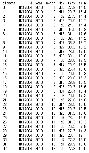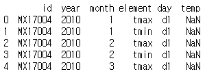 weather_melt = pd.melt(weather, id_vars=['id', 'year', 'month', 'element'], var_name='day', value_name='temp')