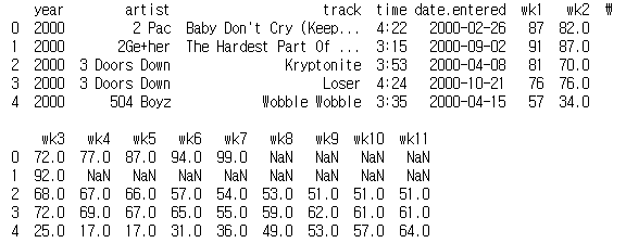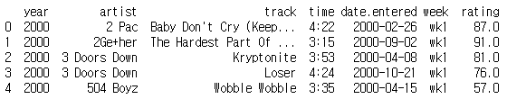 billboard_long = pd.melt(billboard, id_vars=['year', 'artist', 'track', 'time', 'date.entered'], var_name='week', value_name='rating')