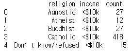 pew_long = pd.melt(pew, id_vars='religion', var_name='income', value_name='count')