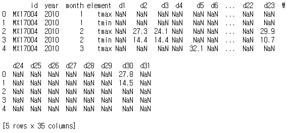 melt 메서드로 일별 온도 측정값을 피벗하자. day열에 날짜 열이 정리되고 날짜 열의 데이터는 temp열에 정리된다.