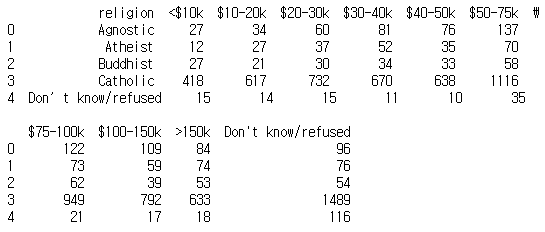 id_vars 인잣값으로 지정한 열을 제외한 나머지 소득 정보 열이 variable 열로 정리되고 소득정보 열의 행 데이터도 value 열로 정리되었다. 이 과정을 'religion 열을 고정하여 피벗 했다'라고 한다.
