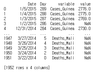 ebola_long = pd.melt(ebola, id_vars=['Date', 'Day'])