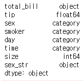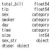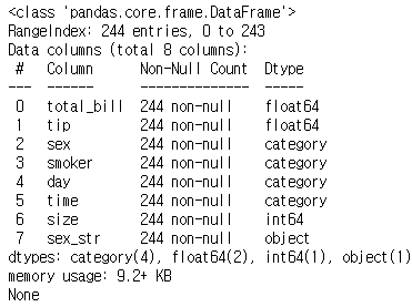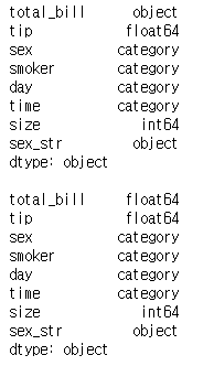 자료형을 변환하려면 astype 메서드를 사용하면 된다. 다음은 astype 메서드를 사용해 sex 열의 데이터를 문자열로 변환하여 sex_str이라는 새로운 열에 저장한 것이다.