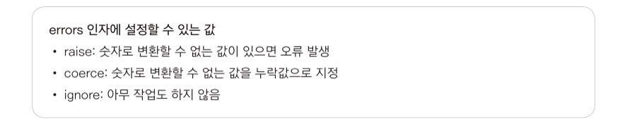 이를 astype으로 float으로 바꿀 수 없다. to_numeric 메서드를 사용해도 문자열을 실수로 변환할 수 없다.