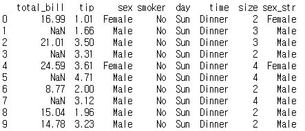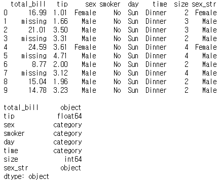 tips_sub_miss.loc[[1, 3, 5, 7], 'total_bill'] = 'missing'