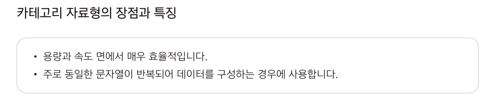 판다스 라이브러리는 유한한 범위의 값만을 가질 수 있는 카테고리라는 특수한 자료형이 있다. 만약 10종류의 과일 이름을 저장한 열이 있다고 가정할 경우 문자열 자료형보다 카테고리 자료형을 사용하는 것이 용량과 속도 면에서 더 효율적이다.