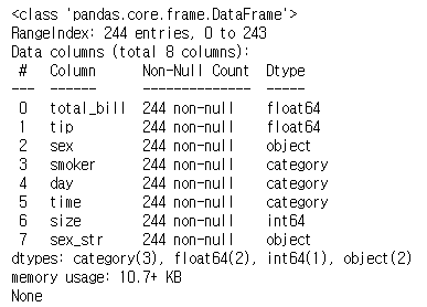 sex 열의 자료형을 문자열로 변환한 다음 데이터프레임의 용량을 info 메서드로 확인하면 10.7 KB 정도이다.