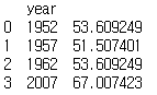 df2 = pd.DataFrame({"year": [1952, 1957, 1962, 2007], "": [y1952_mean, y1957_mean, y1962_mean, y2007_mean]})