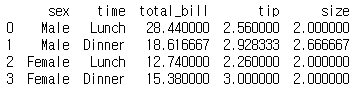 group_method = tips_10.groupby(['sex', 'time']).mean().reset_index()