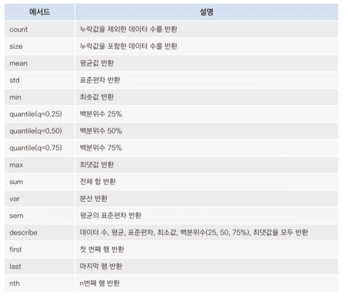 groupby 메서드를 이용하여 뎅;터를 집계할 수 있다. 집계란 데이터에 평균을 구하거나 합을 구하는 등의 의미 있는 값을 도출해 내는 것을 말한다.