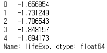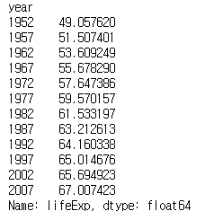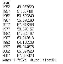 groupby 메서드를 사용해 lifeExp 열의 연도별 평균값을 구했다.