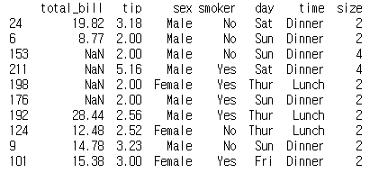 tips_10.loc[np.random.permutation(tips_10.index)[:4], 'total_bill'] = np.NaN
