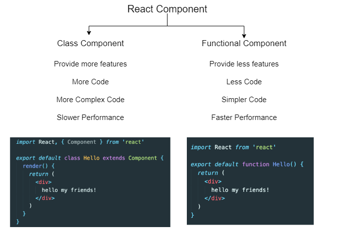 Class Component: 더 많은 기능을 제공한다. 하지만 code가 길어지고 복잡해지며 성능이 좋지 않다.