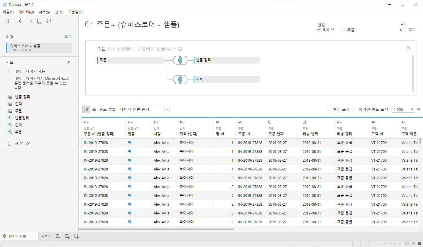 Tableau에서 제공하는 데이터 샘플이 있다. 왼쪽 아래에 보면 '저장된 데이터 원본'이라는 문구를 볼 수 있다.
