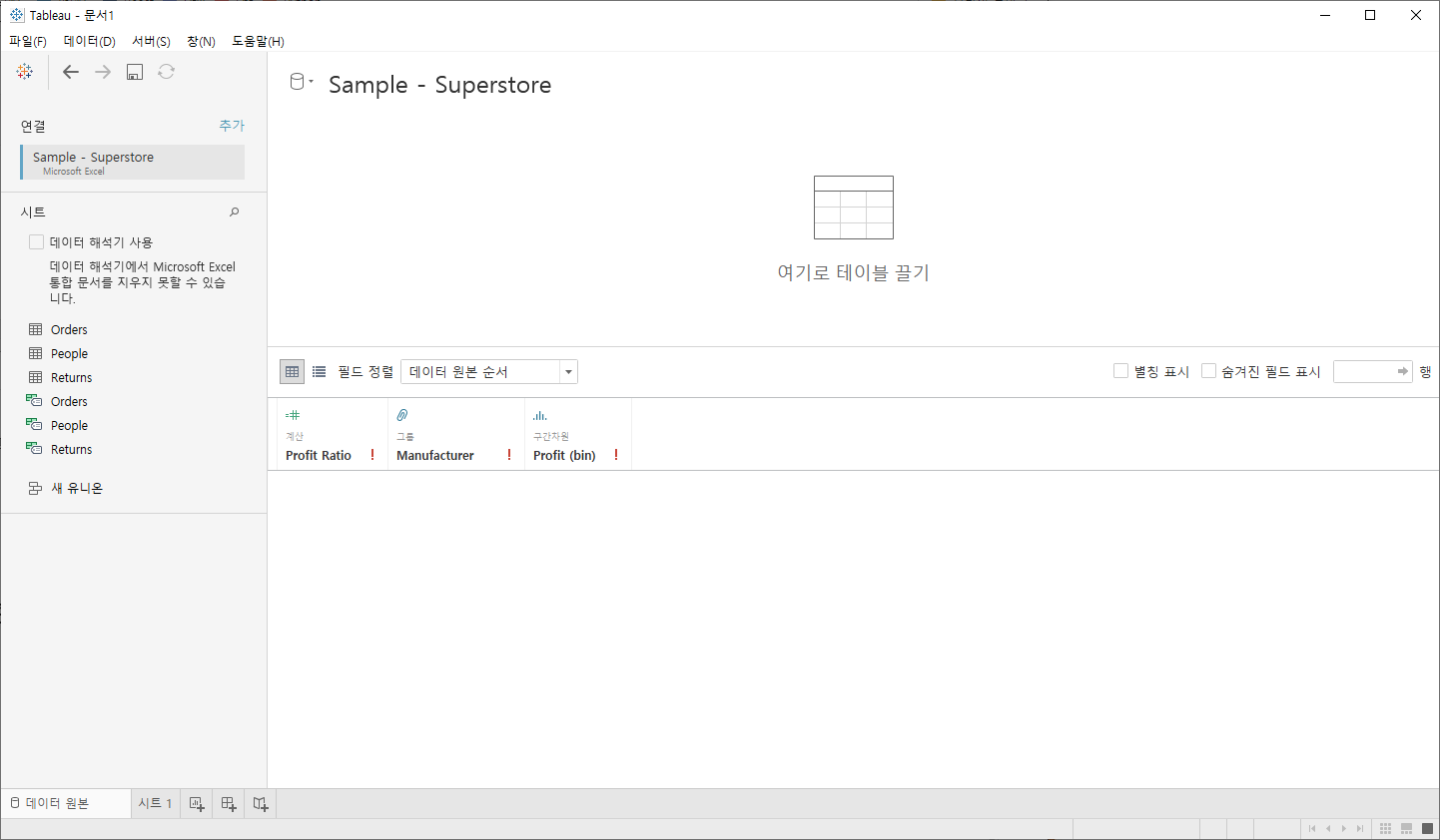 데이터를 준비하는 창을 건너띄고 바로 작업할 수 있게 된다. 왼쪽 태블로 마크를 누르면 다시 데이터를 로드할 수 있는 창으로 돌아간다.