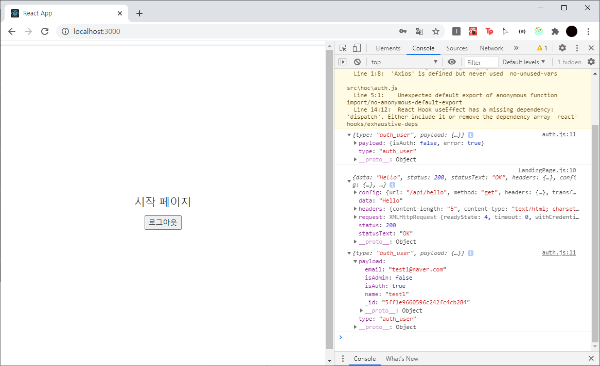 인증이 성공하고 서버에서 넘어온 userData를 확인할 수 있다.
