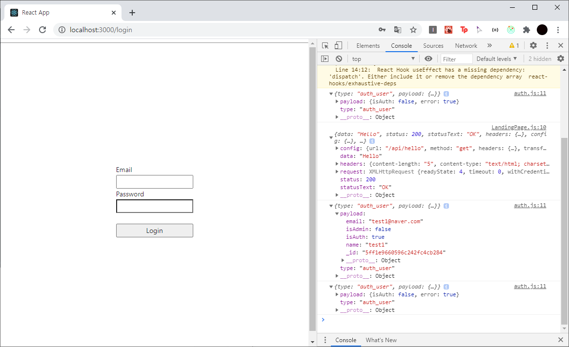 redux를 이용할 것이기 때문에 dispatch를 이용하여 action을 보내야 한다. action 이름은 auth라 지정했고 action을 작성하자.