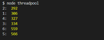 실행할 때마다 시간과 순서가 달라진다. 스레드풀이 작업을 동시에 처리하므로 여섯 개의 작업 중에서 어느 것이 먼저 처리될지 모른다. 1~4의 실행 시간은 비슷하고 5~6은 차이가 있다. 이는 스레드풀의 개수가 네 개이기 때문이다.