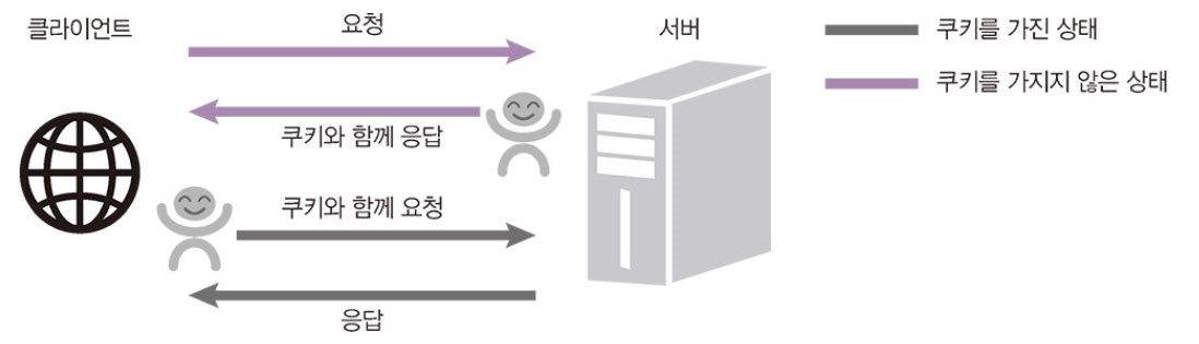 누구인지 기억하기 위해 서버는 요청에 대한 응답을 할 때 쿠키라는 것을 같이 보낸다. 쿠키는 유효 기간이 있으며 name=GR8와 같이 단순한 '키-값'의 쌍이다. 서버로부터 쿠키가 오면 웹 브라우저는 쿠키를 저장해두었다가 다음에 요청할 때마다 쿠키를 동봉해서 보낸다. 서버는 요청에 들어있는 쿠키를 읽어서 사용자가 누구인지 파악한다.