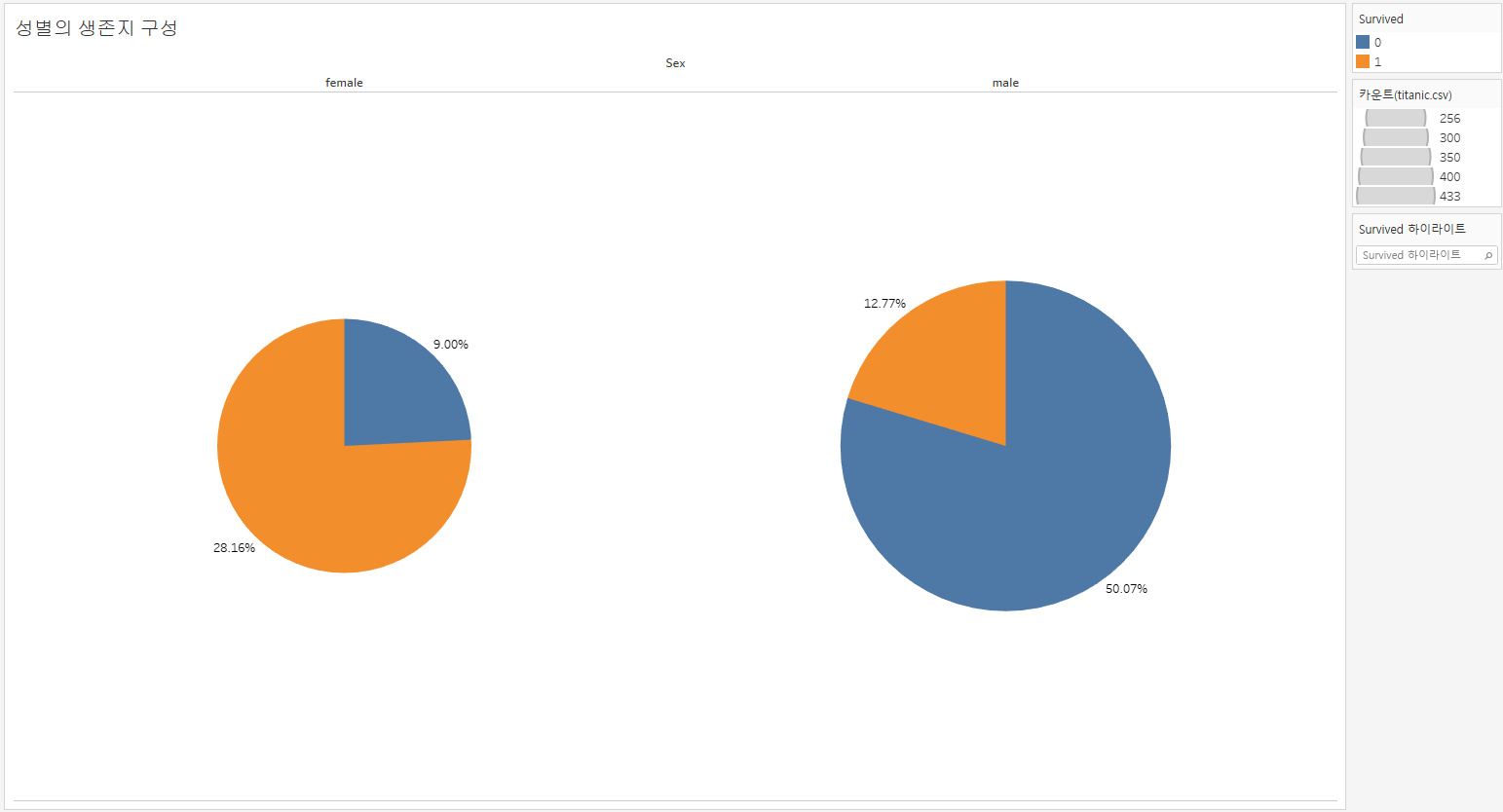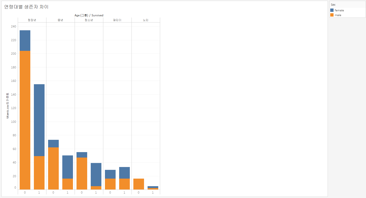 또한 남색이 죽은 사람이고 주황색이 생존자이다. 여성은 남성에 비해 많이 탑승하지 않았지만 생존자가 죽은 사람보다 3배 많다. 그에 비해 남성은 많이 탑승하였지만 생존자가 4배 정도 적다.