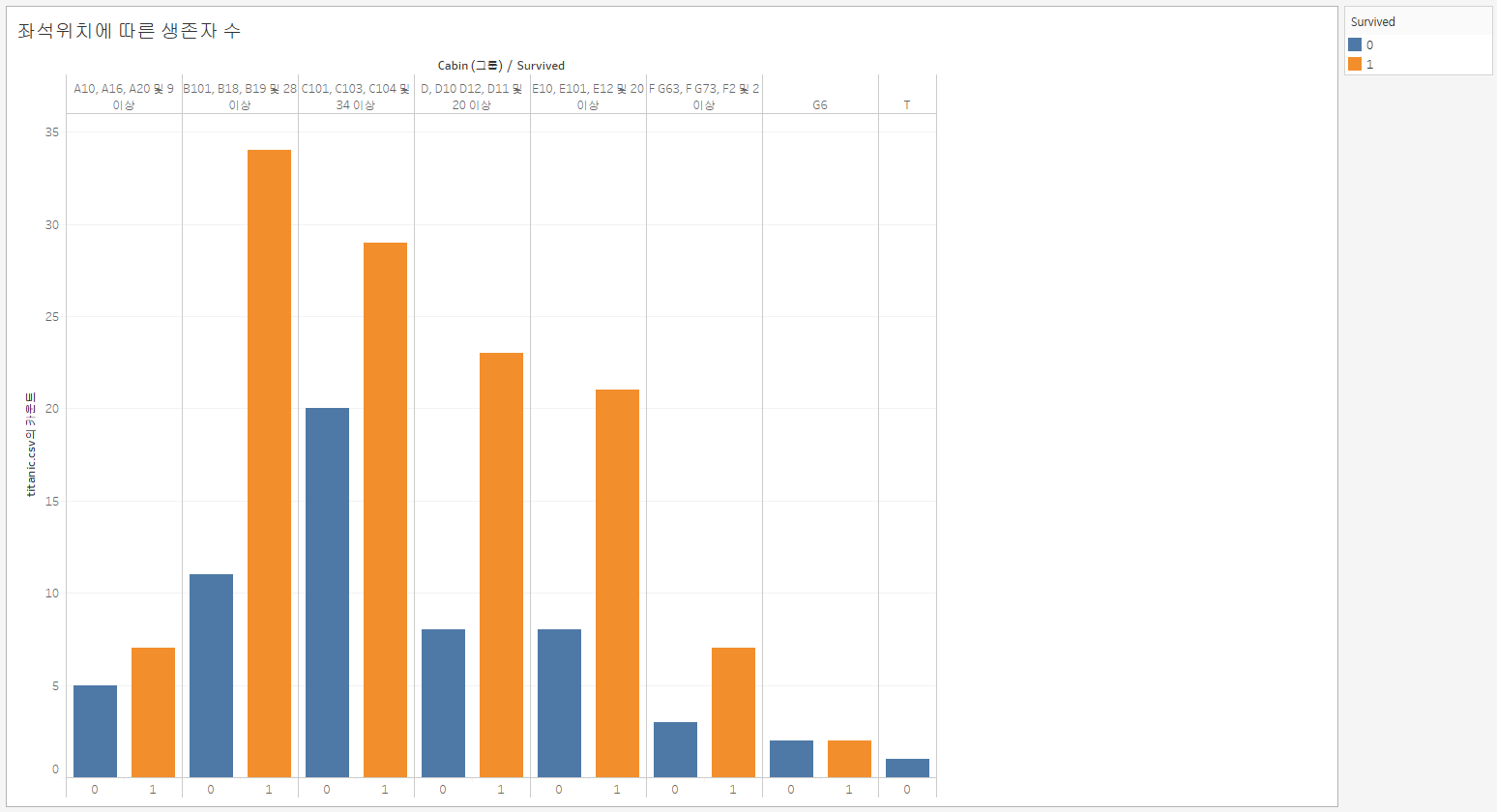 좌석의 위치를 나타내는 데이터를 그룹화하여 구역별로 생존자의 수를 알아 봤다.