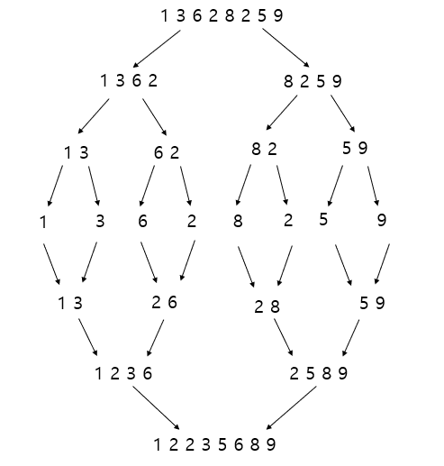 만약 array= {1, 3, 6, 2, 8, 2, 5, 9}라 하였을 때, 이를 4개 2개...로 나눈다. 그리고 알고리즘을 재귀적으로 호출하여 두 부분 배열을 정렬한다. 마지막으로, 정렬된 부분 배열을 병합하여 여덟 개의 원소로 이루어진 정렬된 배열로 만든다.