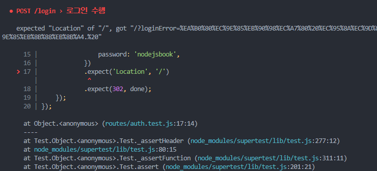 테스트용 데이터베이스에는 현재 회원 정보가 없기 때문에 error가 발생한다. 로그인 라우터를 테스트하기 전에 회원가입 라우터부터 테스트해서 회원 정보를 넣어야 한다.