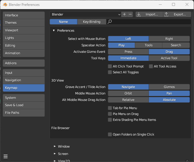 Middle Mouse Action을 변경하면 휠 클릭의 액션을 변경할 수 있다.