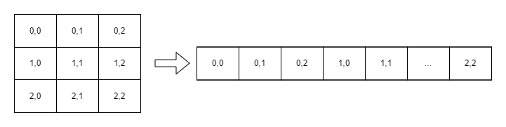 하지만, 헷갈릴 수 있기 때문에 이차원 벡터의 메모리 구조를 본떠 일렬로 펴서 일차원 벡터로 변환한다.