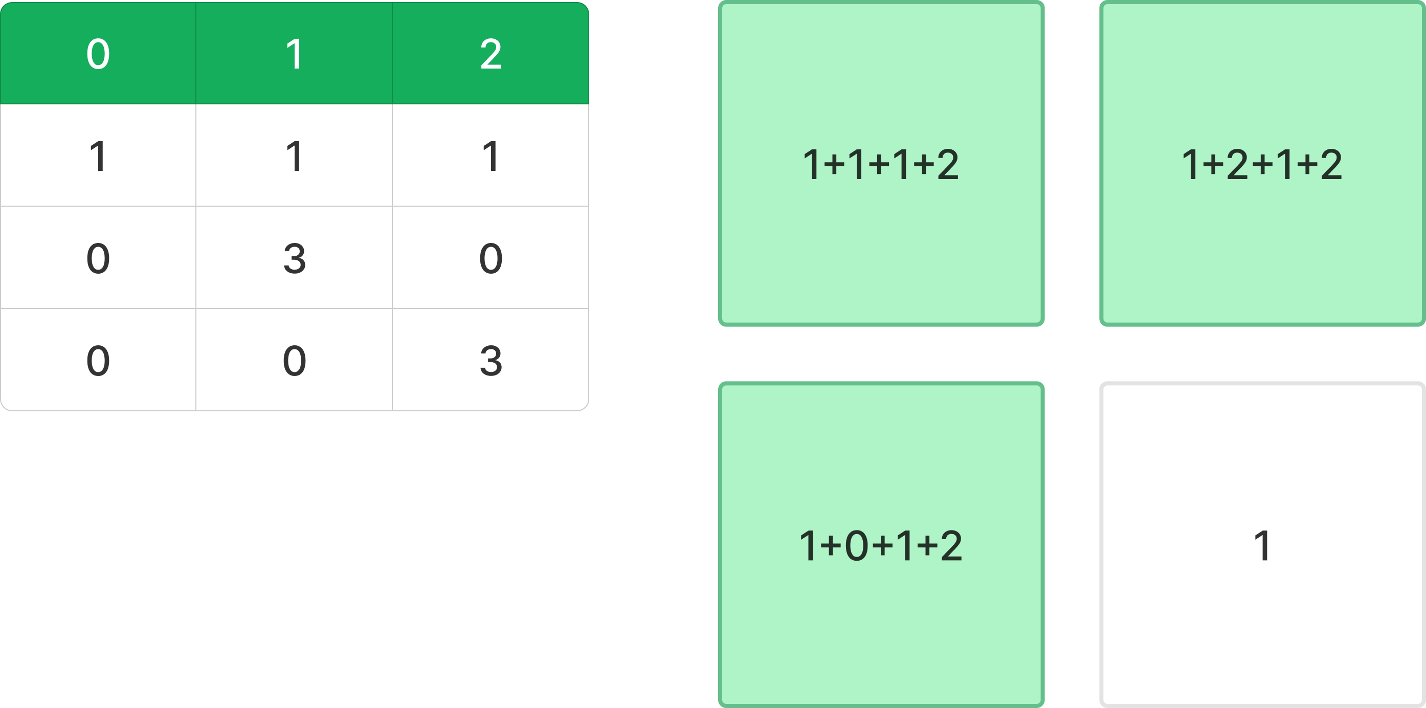 첫날 저녁에 애벌레들은 아래와 같은 크기를 가진다. 예를 들어, 좌표 (1,1)의 애벌레는 왼쪽 애벌레의 크기가 1만큼 자랐고, 왼쪽 위의 애벌레가 1만큼 자랐고, 위쪽 애벌레도 1만큼 자랐으므로, 자신도 1만큼을 자란다. 또, 좌표 (3,3)의 애벌레는 규칙을 따르면 2만큼 자람을 알 수 있다.