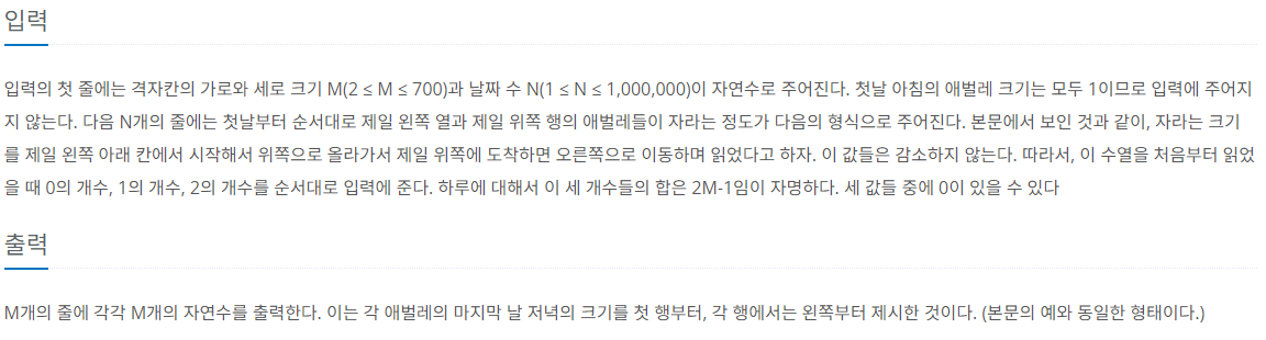 - 제일 왼쪽 열과, 제일 위쪽 행의 애벌레들은 자신이 자라는 정도를 스스로 결정한다. 이들은 입력으로 주어질 것이다. 애벌레들이 자라는 정도를 왼쪽 제일 아래 칸에서 시작하여 위쪽으로 가면서 읽고, 제일 위쪽 칸에 도착하면 오른쪽으로 가면서 행의 끝까지 읽었다고 하자. 모든 입력에서 이렇게 읽은 값들은 감소하지 않는 형태이다.