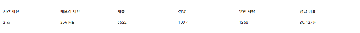 | 2 초 | 256 MB | 6632 | 1997 | 1368 | 30.427% |