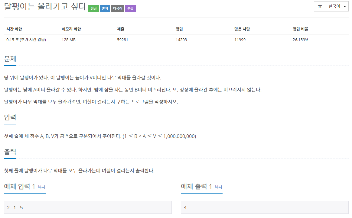 그렇지 않다면 나머지 만큼의 높이가 부족하기 때문에 몫에 마지막 하루 + 나머지 높이 이동에 필요한 하루를 더해주어 출력하면 된다.