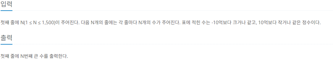 우선, 간단한 풀이는 N*N개의 수를 입력받아 정렬한 뒤 N번째 큰 수를 찾는 것이다.