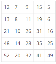 N×N의 표에 수 N2개 채워져 있다. 채워진 수에는 한 가지 특징이 있는데, 모든 수는 자신의 한 칸 위에 있는 수보다 크다는 것이다. N=5일 때의 예를 보자.