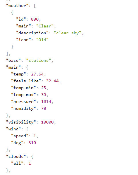 이전 포스트에서 받아온 data의 항목을 보면 "main"이라는 부분과, "weather"이라는 부분을 보면 원하는 정보들이 있다.