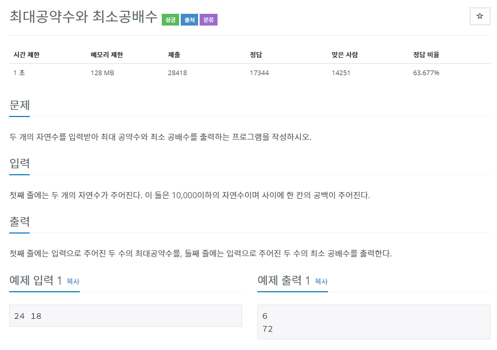 선형적인 탐색법으로 작은 수전까지 하나씩 나누어 보고 둘 다 나누어 떨어지는 수 중 가장 큰 수를 구하면 되겠지만,