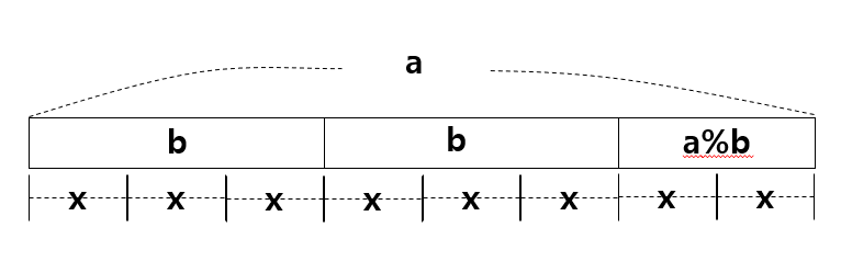 a% b = 2x이다. 우리는 x를 구해야 하기 때문에, 나머지가 0이 될 때, 즉 모든 수가 나누어 떨어질 때까지 계속해서 b를 나머지로 나눈다.