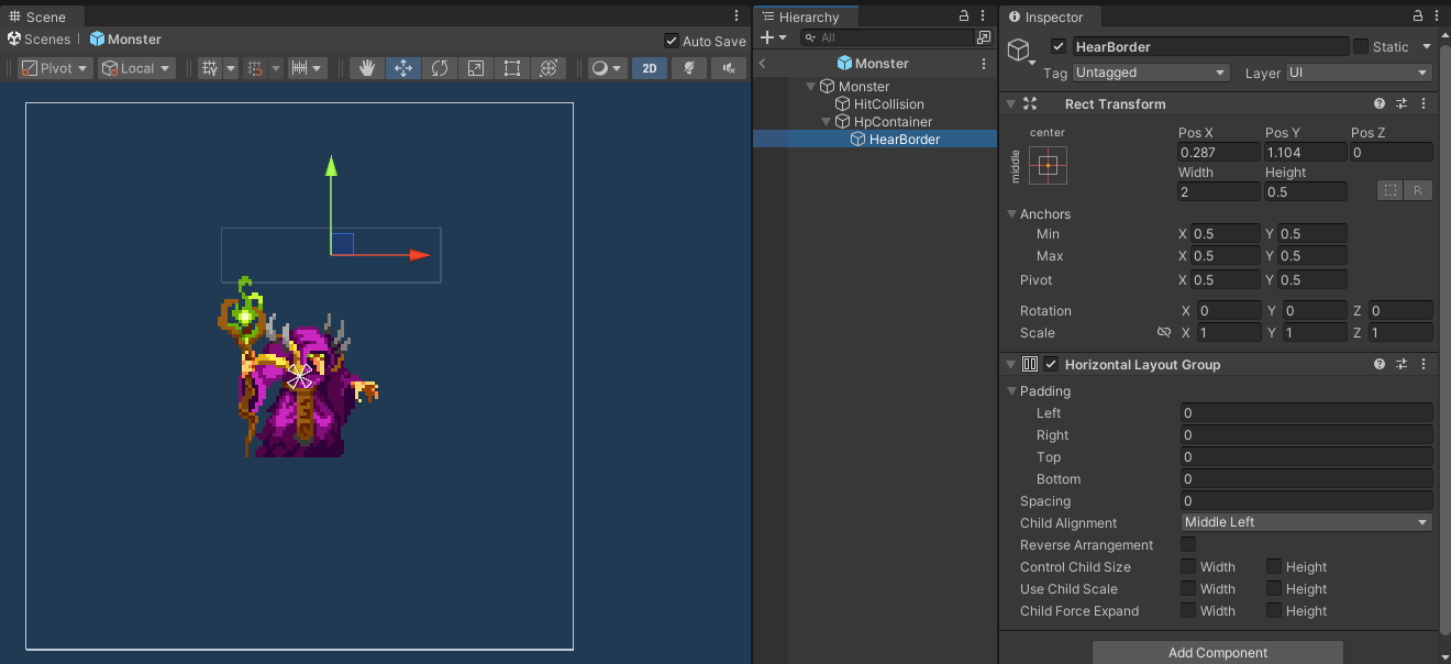 그리고 Health를 시각화할 수 있게 몬스터에 Image를 추가할 수 있는 Canvas와 Container를 추가했다.