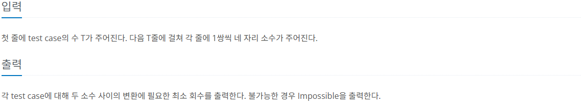 문제를 요약하면, 현재 비밀번호에서 목표한 비밀번호까지 소수로만 변경했을 때 최소 몇 단계의 변환이 필요한지 구해야 한다.