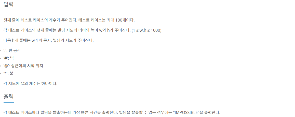 문제를 요약하면, 불이 번지는 빌딩에서 얼마나 빨리 상근이가 탈출할 수 있는지 구하는 문제이다.